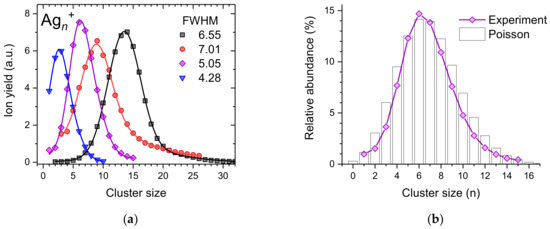 Figure 1a shows a few selected cluster size distributions of silver cluster ions resulting from the pickup of atomic silver vapor (formed via evaporation of bulk silver in an ohmically heated oven) into mass-per-charge selected helium droplets (~2 × 105 He atoms per charge at an average charge state of = 10). Depending on the number of He atoms per charge and the silver vapor pressure, it is possible to shift the average cluster size to any desired value. In the present case, we changed the pressure of the silver vapor by setting the temperature of the oven between 994 K and 1046 K. With increasing temperature, the average silver cluster size increases. All four experimentally determined cluster size distributions (solid symbols) exhibit relatively narrow asymmetric peak shapes that can be effectively reproduced by a superposition of two Gaussian peak functions (solid lines). In the case of small average cluster sizes (blue triangles and magenta diamonds), the centers of the two Gaussians are less than 1.3 cluster sizes apart, whereas this difference increases to up to 5.2 for larger average cluster sizes.