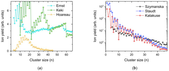 Figure 2 shows several cationic silver cluster size distributions found in the literature. Clusters and nanoparticles of coinage metals have been extensively studied in the past [5,32] due to their potential as catalysts [33,34,35], and their optical [36,37] and biomedical applications [38]. In particular, silver turns out to have pronounced antimicrobial properties [39,40]. Silver clusters have been formed via various techniques, such as inert gas condensation [41]; direct laser vaporization [42]; laser vaporization into a buffer gas and supersonic expansion [43]; ion sputtering [44,45,46]; MALDI [47,48] and pickup into helium droplets [49]. Common to all these studies are pronounced intensity anomalies in the cluster size distributions determined by mass spectrometry (see Figure 2). Electronic shell closures at n = 9 and n = 21, corresponding to 8 and 20 unpaired 5 s electrons, superimposed onto an odd–even oscillation due to spin pairing are clearly observed, irrespective of the average size of the silver cluster ion distributions. In contrast to the present experimental data shown in Figure 1, most of the data taken from the literature (Figure 2) were measured most likely with silver having a natural isotopic composition (107Ag:109Ag = 0.514:0.486). This distributes the ion yield among different masses and reduces the height of the most abundant peak with increasing cluster size. All cluster size distributions, except for the experiments by Ernst and Hauser [49] and Szymanska et al. [48], were determined from the peak heights of the published mass spectra. It is not clear how the ion yield was determined in the other two studies, i.e., peak heights (most abundant isotopologue) or peak areas (sum of all different isotopologues). A correction from areas to peak heights in these cases leads to a decrease in the ion yield with increasing cluster size and better agreement with the other data.