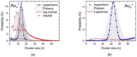 For gold, which has only one stable isotope, we also performed similar measurements, as in the case of silver clusters. Figure 3 shows two cluster size distributions obtained via pickup of gold vapor into multiply charged helium droplets that were formed as neutrals with an average size of about 2 × 106 He atoms and were charged via electron impact at 40 eV electron energy and 500 µA electron current (blue points). With the electrostatic quadrupole bender, we selected droplets that contain between 2.5 × 105 and 4.8 × 105 He atoms per charge. At a heating power of 140 W, the resulting gold cluster size distribution peaks at n = 13 (Figure 3a), while by increasing the oven power to 190 W the most abundant gold cluster shifts to n = 33 (Figure 3b). In both diagrams, we plotted a Poisson distribution (bar graphs) to which we normalized the experimental data. In both cases, the measured cluster size distribution is substantially narrower than the corresponding Poisson distribution. This is surprising, since for a monodisperse helium droplet where the mass loss due to evaporative cooling during the pickup process can be neglected, one can expect a pure Poisson cluster size distribution [50].