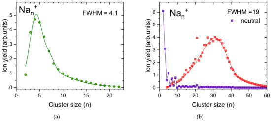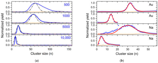 In Figure 7b we compare four experimentally determined cluster size distributions for gold (Figure 3) and sodium (Figure 4), designated with symbols with simulated distributions by optimizing the parameters (average neutral size, n/z, evaporation per pickup, number density of dopants). The values of these parameters are listed in Table S1 in the Supplementary Materials. In three cases we achieved perfect agreement to the experiments and the resulting parameters were very reasonable in comparison to the experimental conditions. Only the sodium cluster size distribution that was obtained at the highest oven temperature (third diagram from above) cannot be simulated. The presence of clear magic numbers in the experimental data at n = 9 and 21 indicates fragmentation of the sodium clusters in the hot pickup cell. Such processes lead to the formation of smaller cluster ions which is not included in our model. For high vapor density of dopants, the amount of He that is evaporated from the droplets will contribute to additional shrinking of the droplets as the fast He atoms reflection from the oven walls will also collide with the droplets. Currently, this is only included in the number of He atoms evaporated per pickup event. In the case of the narrow sodium and gold distributions, about twice the amount of He per pickup event has to be evaporated to obtain these results.