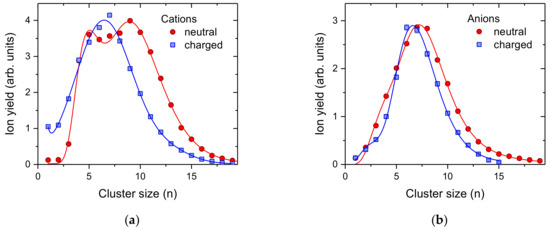 As a final example we investigated the formation of C60 cluster ions of both polarities via pickup into pre-charged helium droplets. We performed these measurements with two different configurations of the same instrument, i.e., electron ionization of neutral He droplets doped with C60 (red circles, Figure 5) [57] and surface impact of charged helium droplets subsequently doped with C60 (blue squares, Figure 5) [58]. The average size of the He droplets initially formed were in all cases about 106 He atoms [59]. He droplets of this size can easily accommodate more than 10 positive charges, however only one anionic charge center [60]. The critical size for negatively charged He droplets carrying two charges is 4 million He atoms. However, in a log-normal distribution with an average value of 4 million, about 8.2% of the droplets contain more than 4 million He atoms that could potentially carry two charges (the probability for triply charging of droplets larger than 15.7 million He atoms is less than 0.3%). Pickup into such large neutral He droplets results in large fullerene clusters due to the high geometric (capturing) cross section of these droplets. If more than one charge center is present, the fullerenes that are picked up will be shared among the charge centers, which results in more than one smaller fullerene cluster ions. Since negatively charged droplets have huge critical sizes for multiply charging [60], under the present conditions, the helium droplets are most likely singly charged. This agrees well with the small difference between pickup into neutral (red circles in Figure 5b) and negatively charged (blue squares in Figure 5b) droplets. In contrast, the yield of large C60+ clusters in the case of pickup into charged He droplets is reduced compared to pickup into neutral He droplets and positive ionization. For cations (Figure 5a), the presence of multiply charged He droplets is much more likely with charge states of up to 50. In order to provide enough C60 for each charge center, the temperature of the oven vaporizing the fullerene powder was increased from 503 K to 549 K. Again, pickup into charged He droplets, even without mass-per-charge selection, results in a narrower size distribution of the dopant cluster ions formed.