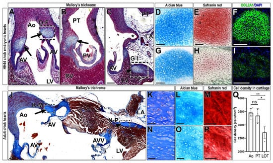 Chick cardiac chondrocyte clusters are ontogenetically heterogeneous. (A–I) Identification of chondrocyte clusters in HH44 chick embryonic hearts. Mallory’s trichrome staining shows an accumulation of fibrous tissue (blue) in the aortic (A) and pulmonary valves (B), and in the LOT region (C). These clusters were identified by Alcian blue (D,G), Safranin red (E,H) and COL2A1 (F,I) staining. (J–Q) Identification and characterization of chondrocyte clusters in the adult chick heart. Mallory’s trichrome staining shows cartilage clusters in the aortic valve (arrow in J, magnified in K) and the LOT region (arrowhead in J, magnified in N). Aortic valve and LOT chondrocytes were identified by Alcian blue (L,O) and Safranin (M,P) staining methods, respectively. Chondrocyte clusters within the aorta and the pulmonary valves showed no significant differences in cell density (cells/mm2) (ns p = 0.57), while LOT chondrocyte accumulations showed a lower cell density than aorta (** p = 0.003) and pulmonary valve (* p = 0.03) ones. Asterisk (*) in C points to the left coronary aortic sinus. Ao, aorta; AV, aortic valve; AVV, atrioventricular valve; LA, left atrium; LV, left ventricle; PT, pulmonary trunk; PV, pulmonary valve; RA, right atrium; RV, right ventricle. Scale bars: (A–C,J): 200 µm; (D–I,K–P): 50 µm.