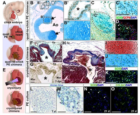 At perinatal stages, quail proepicardial derived cells (QCPN+) were not found in the aortic or the pulmonary valve chondrocyte clusters (Figure 2B,B’ and Figure S4). However, when present, the LOT chondrocytes cluster contained high numbers of QCPN immunoreactive cells (Figure 2C,D and Figure S4). Finally, to test whether the alteration of tissue homeostasis affects epicardial differentiation into chondrocytes in vivo, quail-to-chick proepicardial (PE) chimeras were constructed over cryodamaged chick embryo hosts (Figure 2E). Cryoinjury disrupts ventricular myocardial wall continuity (Figure 2F); the damage site contained large numbers of non-myocardial QCPN+ cells (Figure 2G). Seven days after cryoinjury (HH 35-36 stage), no chondrocyte clusters were found in the injured region (n = 8) (Figure 2F,G). However, at later stages (16 days after cryoinjury; HH45-46 stage), QCPN+ chondrocyte clusters were observed at the wound area in 13% (2/15) of chick damaged hearts (Figure 2H–K). The cartilaginous nature of these cell clusters was confirmed by Safranin red, Alcian blue, and SOX9 nuclear staining (Figure 2I–K); QCPN immunorreactivity was used to reveal the proepicardial origin of cells (Figure 2J).