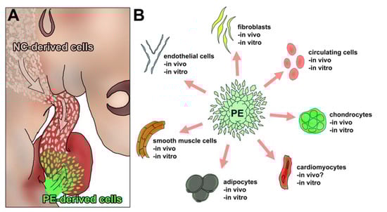 The cellular origin of cardiac cartilage has also been extensively discussed, but the current consensus is that cardiac chondrocytes derive from the neural crest [2]. Since the migration of these cells distally to the base of the cardiac outflow tract is considered an infrequent event [9,10], we did seek to study whether an alternative source for cardiac cartilage exists. Our first candidate was the epicardial-derived mesenchyme, that contributes to a large portion of cardiac ventricular interstitium, coronary vessel walls, atrioventricular cardiac valve primordium mesenchyme, and the annulus fibrosus [24]. This latter element is in contact with the LOT, a cardiac location relevant to cartilage differentiation. The hypothesis of epicardial lineage cells differentiating into chondrocytes is in accordance with the ability of proepicardial progenitor (proepicardial) cells to differentiate into multiple mesodermal cell types [12] (Figure 3). Cell types differentiating from the proepicardium include endothelial cells [25,26,27,28], smooth muscle cells [29,30,31], cardiac fibroblasts [31,32,33,34,35], adipocytes [36], some cardiomyocytes [37,38,39,40,41,42] and circulating cells [43,44]. Our work is the first one reporting on the chondrogenic potential of proepicardial derived cells both in vivo and in vitro. This discovery adds further evidence to the wide mesodermal/connective tissue potential of epicardial lineage cells (Figure 3).