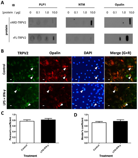 At least four images were taken from cell cultures stained for TRPV2 (green) and Opalin (red) with and without LPS + IFNγ. Colocalization was evaluated using ImageJ and the JACoP plugin [56], which provided Pearson’s and Mander’s coefficient values (0 = no overlap; 1 = total overlap). The M1 (MOpalin) coefficient estimates the degree of red signal overlapping green, the M2 (MTRPV2) coefficient and vice versa.