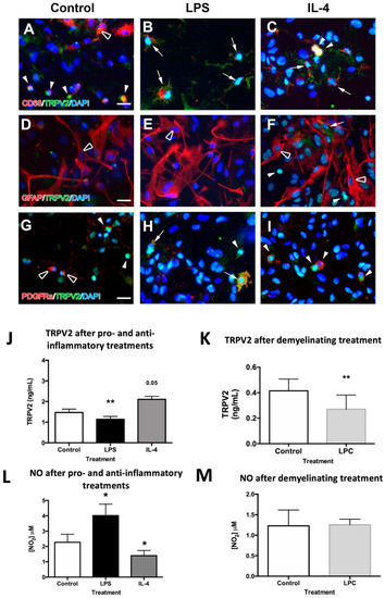TRPV2 expression in mixed glia cultures of mice after pro-inflammatory (LPS), anti-inflammatory (IL-4) and demyelinating (LPC) treatments. (A–I) Double immunohistochemical staining allowed for the determination of whether TRPV2 was expressed in microglia (A–C), astrocytes (D–F) or oligodendrocyte cells (G–I). TRPV2 was highly expressed in the cell body of some microglia (full arrowheads) but not all of them (empty arrowheads) in control conditions, and TRPV2 was spread afterwards through the cell body of activated microglia cells, with an expression pattern highly coincident with CD68+ lysosomes (arrows). While no expression of TRPV2 was found in astrocytes (empty arrowheads), OPCs showed either low or absent expression in control conditions (full and empty arrowheads, respectively) and increased expression throughout the cell body (arrows) and the principal soma (arrowheads) after both pro-inflammatory and anti-inflammatory treatments. (J,K) Quantification of TRPV2 protein (ng/mL) by ELISA in secondary mixed glial cultures in control conditions, and after LPS and IL-4 treatments (J) and in quaternary mixed glial cultures, containing myelin-binding protein (MBP)+ oligodendrocytes, in demyelinating conditions (K). Determination of TRPV2 showed a significant decrease in TRPV2 after LPS and LPC treatments (J,K), and an increase after IL-4 treatment (p = 0.05) compared to control conditions (J). (L,M) Quantification of NO secondary mixed glial cultures in control conditions, and after LPS and IL-4 treatments (L) and in quaternary mixed glial cultures in demyelinating conditions (M). An increase in NO concentration was observed in cell cultures after LPS treatment compared to control conditions, while a significant decrease was observed after IL-4 treatment. After LPC treatment, NO remained stable compared to the control. Statistical analysis was performed by one-way ANOVA followed by Dunnett’s multiple comparison compared to the control in the LPS and IL-4 treated cultures (* p < 0.05, ** p < 0.01), and a paired Student’s t-test for LPC treatment (** p < 0.01). Scale bar (A–I) = 25 µm.