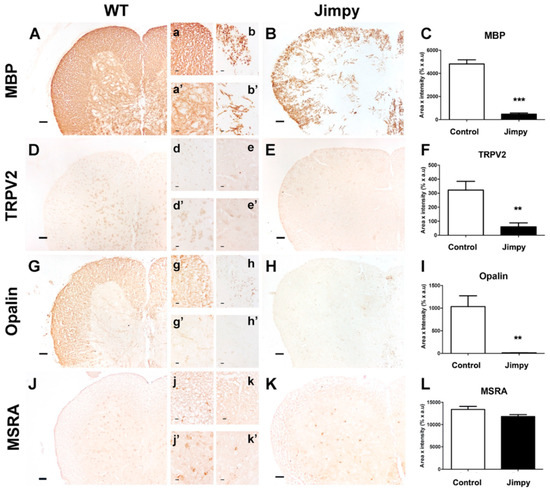 TRPV2, Opalin and MSRA expression in spinal cord of wild-type (WT) and hypomyelination jimpy mice. Immunohistochemical staining against MBP (A,B), TRPV2 (D,E), Opalin (G,H) and MSRA (J,K) were performed in spinal cord sections of 21-day-old WT and jimpy mice, and immunoreactivity was quantified and analyzed as Area x Intensity. Results show that MBP was importantly reduced in both GM (a,b) and WM (a’,b’) of jimpy mice compared to WT (A–C). TRPV2 expression was mainly located in neurons in GM (d’) and glial cells, putatively oligodendrocytes, and in WM (d) of WT. A significant decrease in TRPV2 expression in the spinal cord of jimpy mice was observed compared to WT (E,F,e,e’). Opalin expression was importantly found in WM of WT mice (G,g), and to a lesser extent also in GM (g’), but showed a marked decrease in WM and GM of jimpy mice (H–I,h,h’). MSRA was the only molecule that did not suffer an important reduction of its expression in both WM (j,k) and GM (j’,k’) in jimpy mice (L). Results were expressed as mean ± SEM. Statistical analysis of the results were performed with an unpaired Student’s t-test (** p < 0.01, *** p < 0.001). Scale bar (A–K) = 50 µm; (a–k,a’–k’) = 20 µm.