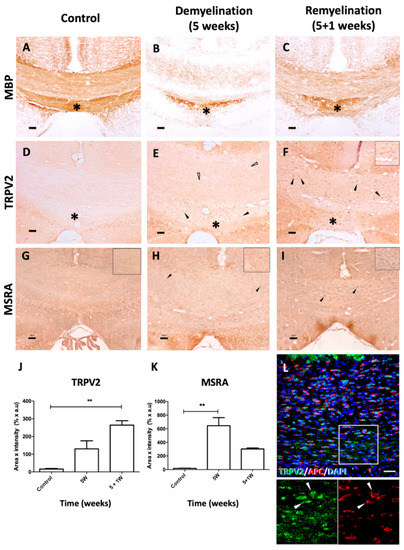 To investigate TRPV2 and MSRA roles in demyelination, we used two experimental models of demyelination: the cuprizone-induced model and the EAE model. The effects of cuprizone intoxication on myelination were observed after MBP immunodetection: after a 5-week treatment, a substantial demyelination of specific WM areas, such as the corpus callosum (CC), was observed compared to basal conditions (Figure 4A,B), and cuprizone withdrawal allowed CC remyelination one week after (Figure 4C), as already quantified in previous work [22]. In the CC of control mice, TRPV2 and MSRA showed very low to undetectable levels (Figure 4D,G). After a 5-week cuprizone treatment, demyelinated CC showed a slight qualitative increase in TRPV2 (Figure 4E,H) that was mainly located in cell bodies of the CC, putatively oligodendrocytes (Figure 4E). In the caudal CC area, known to be resistant to myelination, TRPV2 increase was more visible (Figure 4D–F). After one week of remyelination, TRPV2 expression was significantly increased in mature oligodendrocytes of the CC when compared to control groups (p < 0.01) (Figure 4F, inset, J,K), as we confirmed with a double immunostaining against adenomatous polyposis coli (APC), and its levels were almost duplicated compared to demyelinated animals (Figure 4L). In the case of MSRA, a significant increase of this protein was observed after demyelination (p < 0.01) (Figure 4H,K), since most cells in the CC expressed low levels of MSRA. Later, after one week of remyelination, MSRA levels decreased, and only some MSRA+ cells were observed in the CC (Figure 4I,K).