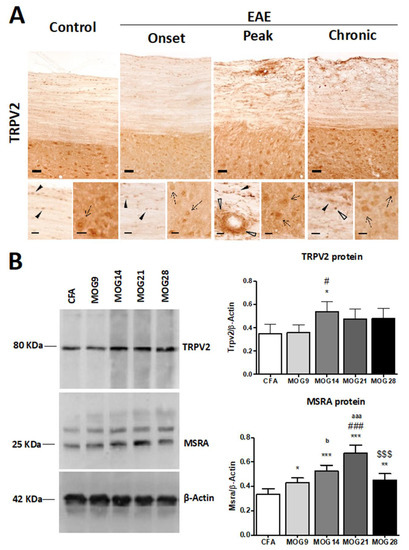 TRPV2 expression in spinal cord samples from WT and EAE mice. (A) Immunohistochemical staining of TRPV2 in spinal cord of control and EAE-induced mice in the onset, peak and in the chronic phase, during remission. In control conditions, TRPV2 is expressed in neurons in GM (inset, arrows), and in oligodendrocytes in WM (inset, arrowheads). After EAE induction, an increase in TRPV2 expression is mainly located in inflammatory focuses at the peak clinical symptomatology in WM (empty arrowheads). (B) MSRA and TRPV2 protein expression in thoracic spinal cord samples from CFA and MOG mice (9, 14, 21 and 28 days post-immunization). (B) A significant increase in TRPV2 protein levels (#, p = 0.0014) is determined in MOG14 mice when compared with CFA (p < 0.05) and when compared with MOG9 (p < 0.05). A significant increase (p < 0.05) in MSRA protein levels is observed in all groups of mice treated with MOG when compared with CFA mice, as well as between different groups treated with MOG: MOG9 vs. MOG21 (###, p < 0.001), MOG9 vs. MOG14 (b, p < 0.05), MOG21 vs. MOG28 ($$$, p < 0.001), MOG14 vs. MOG21 (aaa, p < 0.001). Bars show mean ± SEM; * p < 0.05, ** p < 0.01 and *** p < 0.001 vs. CFA using one-way ANOVA and Newman–Keuls post-test. Scale bars = 50 μm; (insets) = 20 μm.