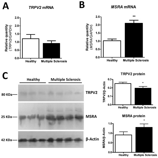 Gene and protein expression of TRPV2 and MSRA was explored in frontal cortex tissue samples of healthy (n = 4) and MS subjects (n = 6). In MS subjects, a non-significant tendency to decrease of TRPV2 mRNA levels was observed when compared to healthy subjects (Figure 6A). On the contrary, MSRA mRNA expression in MS subjects was found to be significantly upregulated (p = 0.0014) when compared to healthy subjects (Figure 6B). TRPV2 and MSRA protein levels were also determined by western blot (Figure 6C). Protein levels of both MSRA and TRPV2 showed the same tendency as the mRNA expression analysis (Figure 6A–C): while a significant decrease of TRPV2 protein levels was observed in MS patients when compared to the control (p = 0.0232) (Figure 6C), MSRA protein expression levels were also significantly increased in MS patients compared to healthy subjects (p = 0.0124) (Figure 6C).