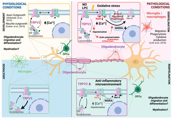 TRPV2-centered cellular cross-talk model in physiological and pathophysiological myelination. During embryonic development, TRPV2 develops an essential role in neurite and axon outgrowth. In that period, TRPV2 is known to be expressed and activated in neurons, and putatively in OPCs, where possible cross-talk between both cells might be triggered through TRPV2 activation. In adulthood, TRPV2 expression is found in microglia, neurons and oligodendrocytes. Upon an insult such as demyelination, TRPV2, as a non-selective ion channel, is activated. Some known triggering stimuli are NO, LPC or oxidative stress, the latter causing methionine oxidation which facilitates TRPV2 sensitization. TRPV2 activation promotes a sodium/calcium inward influx from extracellular media and/or ER or endosomes. Consequently, cells are depolarized, which initiate processes such as actin polymerization or phagocytosis in microglia or innate immune cells. In those cells, TRPV2 has been involved in migration, phagocytosis or cytokine production. TRPV2 inactivation is promoted by MSRA enzyme, by reducing oxidized methionine. In our results, we observed both an increase of TRPV2 and MSRA in demyelinating scenarios. During remyelination, OPCs proliferate and migrate to the demyelinated area, where they differentiate through several stages to mature oligodendrocytes, and start myelination. Our results showed increased TRPV2 expression during this period. Overall, ubiquitous TRPV2 expression and activation in de- and remyelinating processes suggest a multicellular cross-talk that promotes myelin repair at all levels. TRPV2 is relevant in development and demyelination, making this model suitable for the recapitulation hypotheses. Created with BioRender.com (accessed on 10 January 2022) [8,9,10].
