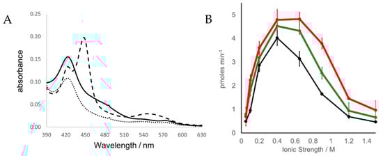 (A) CO binding assays of ARO-BMR chimeras. Oxidized, reduced, and CO bound spectra are shown in solid, dotted, and dashed lines, respectively for ARO-BMR. (B) Ionic strength dependence of ARO-BMR chimeras’ activity. Activities of ARO-BMR, ARO-BMR-3GLY, and ARO-BMR-5GLY are reported in black, green, and red respectively.