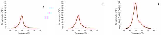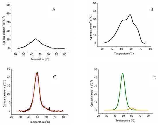 As a term of comparison, DSC was also carried out on the CYP3A4 alone. As shown in Figure 2B, also in the case of CYP3A4 the unfolding shows a poorly cooperative transition that is symptomatic of a low energy barrier to unfolding and unstable molecule that implies the presence of several protein populations. The data are in line with previous reports on this protein that was found to be aggregated with a Tm of 52.6 °C and a Tonset > 30 °C []. When compared to ARO, CYP3A4 shows a slightly higher Tonset because it starts denaturing above 30 °C.