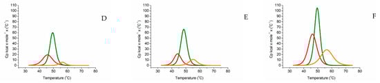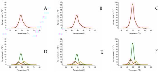 Analysis of the thermogram going from the lower to the higher temperatures, and comparing the profiles obtained from the separate proteins, it was possible to assign the first peak to aromatase [], the second one to the FAD domain of BMR and the third to its FMN domain (Figure 3D–F).The assignment of the peaks is strongly influenced by the cooperative behavior of BMR that is highly conserved in the isolated and chimeric proteins (Figure 2C and Figure 3A–C). Therefore, deconvolution analysis indicates the presence of three peaks corresponds to three protein domains (Figure 3D–F). However, when thermal unfolding experiments were carried out on the 3A4 chimeras, all three proteins showed a high energy barrier to denaturation and again 3A4-BMR-5GLY shows the highest enthalpy, following the same pattern observed for the ARO-BMR chimeras (Figure 4A–C). These data clearly show a stabilization effect driven by the fusion protein that is responsible for a cooperative unfolding process.