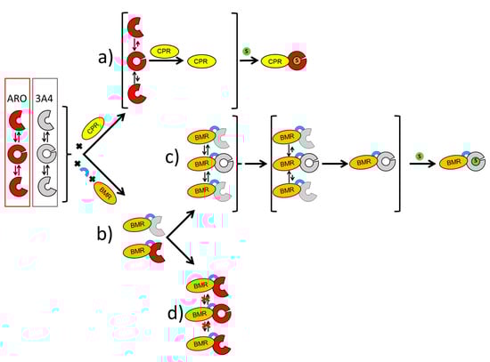 Effect of the molecular Lego on different CYPs P450. (a) Aromatase explores different conformational states and CPR is a positive effector in facilitating the pursuit of the optimal conformation for substrate binding []. (b) 3A4-BMR or ARO-BMR chimeras. (c) 3A4-BMR is able to perform the conformational transitions required for optimal substrate binding (d) BMR, although interacting with ARO as demonstrated by DSC data, is not able to allow the required conformational transitions that are necessary for optimal substrate binding in ARO.