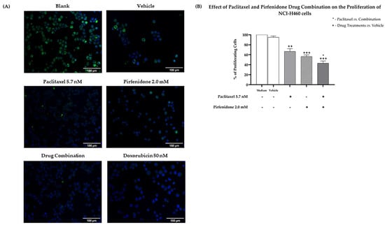 2.2. The Combined Treatment of Paclitaxel with Pirfenidone Efficiently Reduces NCI-H460 Cell Viability and Proliferation
