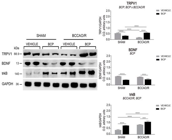 Western blot analysis of the frontal cortex homogenates in vehicle-treated and beta-caryophyllene (BCP)-treated rats either in sham-operated or after bilateral common carotid artery occlusion followed by reperfusion (BCCAO/R). (Left) Transient receptor potential vanilloid type-1 receptor (TRPV1), brain-derived neurotrophic factor (BDNF), tyrosine kinase receptor B (trkB), glyceraldehyde-3-phosphate dehydrogenase (GAPDH) proteins. (Right) Densitometric analysis of the band gray levels expressed as a percentage of the optical density (O.D.) ratio of TRPV1-, BDNF-, trkB-positive bands to those immunostained for GAPDH. Data are reported as the mean values of 12 vehicle-treated and 10 BCP-treated rats for each experimental condition. Error bars depict the standard error of the mean (S.E.M.). Asterisks denote significant differences. Two-way ANOVA with the Tukey’s test for post-hoc analyses was applied to evaluate statistical differences between groups. BCCAO/R, significant effect of BCCAO/R; BCP, significant effect of BCP-treatment; BCP × BCCAO/R, significant BCP-treatment × BCCAO/R interaction. *** p < 0.001; **** p ≤ 0.0001 (see Table 1 for F-values and p-values relevant to effects of BCCAO/R and BCP pre-treatment and to the interaction between them).