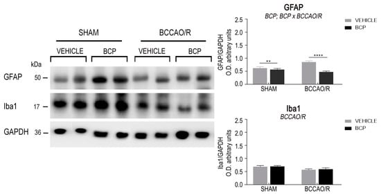 Western blot analysis of the frontal cortex homogenates in vehicle-treated and beta-caryophyllene (BCP)-treated rats either in sham-operated or after bilateral common carotid artery occlusion followed by reperfusion (BCCAO/R). (Left) Glial fibrillary acidic protein (GFAP), ionized calcium-binding adapter molecule 1 (Iba1), glyceraldehyde-3-phosphate dehydrogenase (GAPDH) proteins. (Right) Densitometric analysis of the band gray levels expressed as a percentage of the optical density (O.D.) ratio of GFAP- and Iba1-positive bands to those immunostained for GAPDH. Data are reported as the mean values of 12 vehicle-treated and 10 BCP-treated rats for each experimental condition. Error bars depict the standard error of the mean (S.E.M.). Asterisks denote significant differences. Two-way ANOVA with the Tukey’s test for post-hoc analyses was applied to evaluate statistical differences between groups. BCCAO/R, significant effect of BCCAO/R; BCP, significant effect of BCP-treatment; BCP × BCCAO/R, significant BCP-treatment × BCCAO/R interaction. ** p < 0.01; **** p ≤ 0.0001 (see Table 1 for F-values and p-values relevant to effects of BCCAO/R and BCP pre-treatment and to the interaction between them).