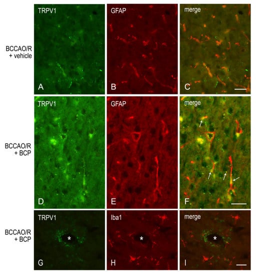 This last inferring is further supported by our findings that after the BCP-treatment, beyond the TRPV1 increase, significant GFAP downregulation and partial TRPV1-/GFAP-like immunoreactivity colocalization were detectable in the BCCAO/R compared to the vehicle-treated rats. While the evaluation of GFAP expression in our setting warrants further investigations to clarify the astroglial involvement in the regulation of TRPV1 relative levels in the brain after BCCAO/R, it is tempting to hypothesize that the TRPV1-bearing astrocytes may be contributing to the regulation of vascular tone under the hypoperfusion/reperfusion challenge. Interestingly, TRPV1-positive astrocytes have already been demonstrated in the rat spinal cord [] and brain []. As already suggested [], astrocytes may represent another critical element by which TRPV1 may intervene to regulate the vascular bed, either by modulating the tone of cerebral vessels or modulating the blood-brain barrier permeability in response to an inflammatory challenge. Indeed, though with a time longer than that of our BCCAO/R model, it has been shown that the inflammatory milieu generated by 2.5 h of ischemic brain injury stimulated a strong astroglial response. This response was featured by cell hypertrophy and hyperplasia [,], and it was suggested that it may lead to an increased expression of GFAP, partly because the number of GFAP-positive astrocytes increases [].