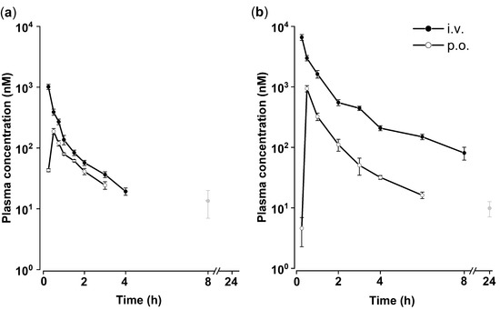 Mean plasma concentration-time profiles of SH045 after single intravenous (i.v.) and peroral administration (p.o.) of 2 mg/kg BW (a) and 20 mg/kg BW (b). Data are expressed as mean ± SEM (n = 6, independent values from 6 animals). Grey symbols represent means of only three determined plasma concentrations above the limit of quantification.