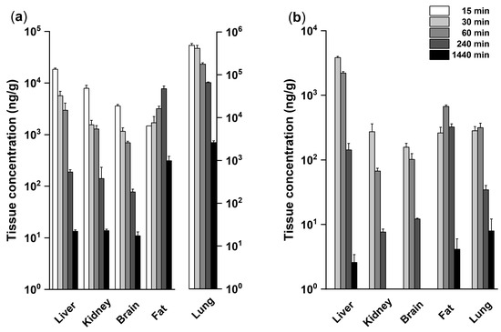Tissue distribution of SH045 at 24 h after single (1×) and repeated (5 days, once a day) i.v. administration of SH045 (20 mg/kg BW). Data are expressed as the mean ± SEM, n = 6.