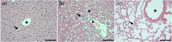 Examples of hematoxylin-eosin stained tissues slices of liver (a), kidney (b) and lung (c) of mice treated on five days, once a day, with SH045 (20 mg/kg BW, i.v.); (a): central vein (asterik), hepatic sinusoid (arrow); (b): renal corpuscle (arrow), proximal tubule (asterik), distal tubule (triangle); (c): alveoli (arrow), bronchiole (star). Scale bar: 100 µm.