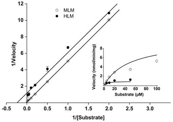 Metabolization rate of SH045 in mouse (MLM) and human (HLM) liver microsomes (0.5 mg/mL protein) in the presence of NADPH in relation to various substrate concentrations (SH045 0.5 to 100 µM) presented as Lineweaver-Burk-Plot. Inset: original data of Michaelis-Menten kinetics; velocity (nmol/min/mg) = ∆substrate concentration/incubation time/enzyme concentration. Data are given as mean ± SEM, n = 3.