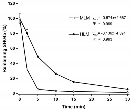 For this purpose, remaining concentrations of SH045 in microsomes were determined to calculate the intrinsic microsomal clearance CLint,micr, the intrinsic clearance CLint, equal to the maximum enzyme activity of liver and for in vitro-in vivo exploration of hepatic clearance CLhep in mouse and human using the well-stirred model [28]. The algorithm for these calculations is given in detail in the Supplementary Materials SM8.