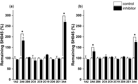 To determine possible metabolizing pathways of SH045 in MLM and HLM, an in vitro inhibition approach was performed with CYP-isoform specific inhibitors.