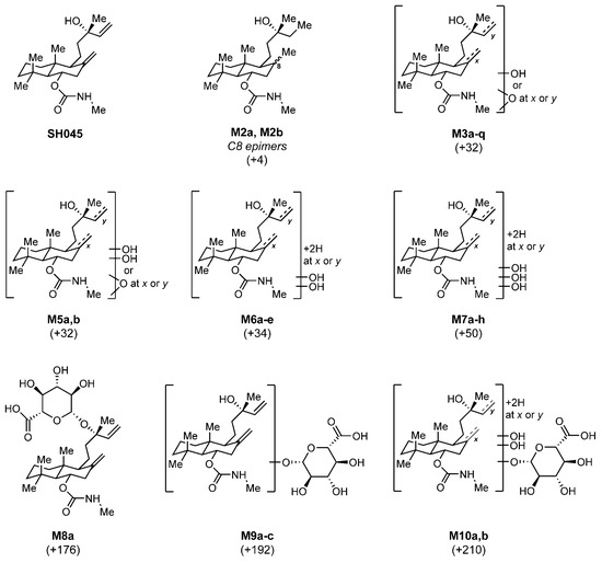 Structure of SH045 and proposed metabolites detected in MLM, HLM (for both: NADPH, UDPGA) and urine according to LC-MS/MS data. Mass shifts in relation to SH045 in brackets. For detailed information about occurrence of metabolites see Table 4. For discussion of EPI (MS/MS) data and more detailed assignment of selected structures see Supplementary Materials SR6.