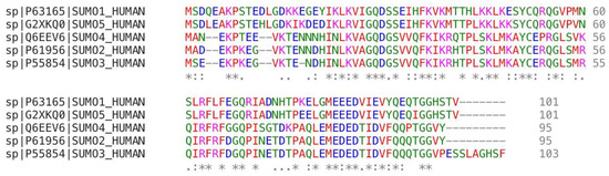 The sequence alignment results of human SUMO isomers. “*” represents the identical amino acid residues; “:” means the roughly similar molecular weight and hydrophilicity; “.” represents there are similar and dissimilar residues in this column.