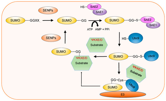 Overview of SUMOylation process. Maturation: Sentrin-specific proteases (SENPs) family converts SUMO into a mature form, which depends on C-terminal hydrolase activity of the family to cleave SUMO precursors, thereby exposing its diglycine residues. Activation: Mature SUMO is activated by the E1 enzyme, the cysteine residue of E1 is attached by SUMO to form a thioester bond between SUMO and SAE2 in an ATP consuming reaction. Conjugation: The activated SUMO is then transferred to the catalytic cysteine of the sole E2 enzyme Ubc9, forming a SUMO-Ubc9 thioester bond via an isopeptide linkage. Ligation: The specific lysine residue of substrate is attached by SUMO with the help of E3 ligases. De-modification: SENPs remove SUMO molecules from substrates, and the released SUMOs can be used in next cycle [15].