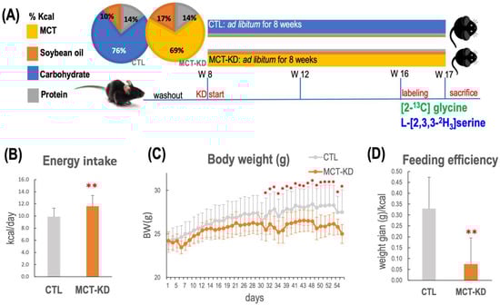 In vivo experimental design for investigation of ketogenesis on 1C metabolic fluxes. Body weight, energy intake, and feeding efficiency over the 8-week dietary intervention are shown. (A) Study design. After 1 week of habituation, mice were divided into 2 groups and fed with either a control diet (CTL) or a medium-chain enriched triglyceride ketogenic diet (MCT-KD) for 8 weeks. The 2 pie charts present the diet compositions of macronutrients. Ketone measurements were taken 4 weeks after diet intervention. (B) The mean energy intake of MCT-KD-fed mice was greater than that of the mice fed the (CTL) diet. (C) The body weight changes during the intervention period. The mean body weight of MCT-KD-fed mice became significantly lower 30 days after the initiation of the diet intervention. (D) The feeding efficiency was calculated as the total body mass gain divided by total kcal for each individual animal over the duration of the study. Feeding efficiency of MCT-KD was significantly lower than the CTL diet. For (B–D), data values represent group means (±SEM, MCT-KD, 12/group, * p < 0.05 vs. CTL, ** p < 0.01 vs. CTL).