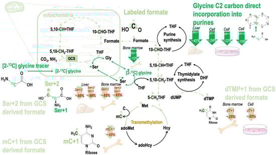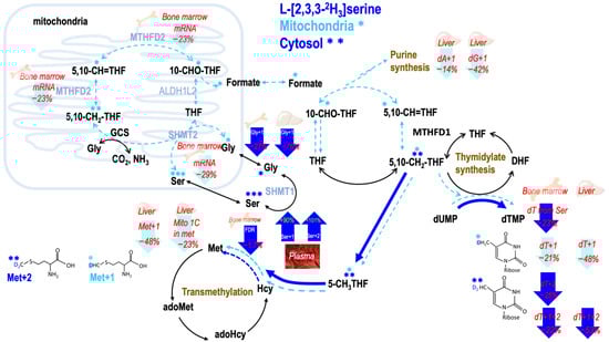 L-[2,3,3-2H3]serine was then used to trace the partitioning of serine 3-carbon between mitochondria and cytosol in dTMP synthesis in vivo. The fractional 1C fluxes from mitochondria were 90% in mouse bone marrow and 91% in mouse liver. These results matched well with the literature as well as our own previous studies [24], proving successful in vivo labeling was conducted.