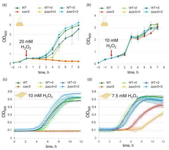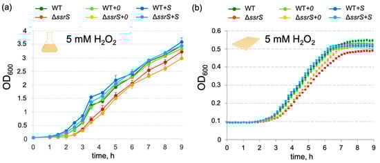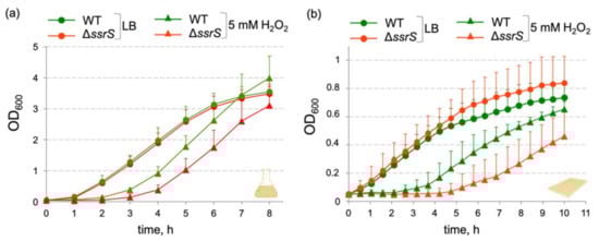 This relative outgrowth delay reached 1 to 2 h (Figure 1) or even up to 4 h in other experiments (Figure S1). The exact period of the lag phase varied between individual experiments, possibly due to fluctuations in media preparations that might affect the rate of H2O2 reduction. The phenotype was reproducibly observed for growth in liquid culture flasks (Figure 1a) and 96-well plates (Figure 1b) despite the differences between these two setups, including medium volume, stirring speed and aeration. In the presence of 2 mM H2O2 we observed the same effect, although the lag phase extension of the ΔssrS strain tended to be somewhat shorter (~ 1 h; Figure S2). The presence of 10 mM H2O2 caused very long (>12 h) outgrowth delays for both, the WT and ΔssrS strain, with increasing variations between replicates (data not shown), thus excluding the calculation of meaningful average growth curves.