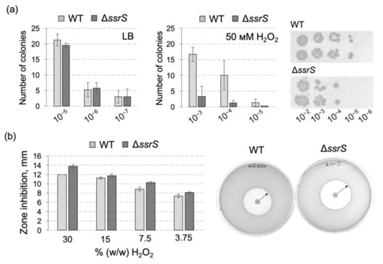 To explore whether retarded growth of the knockout strain resulted from a higher frequency of cell death, we analyzed the number of survivor colonies after H2O2 treatment by plating of serial culture dilutions. To further accentuate the difference between the two strains, we increased the concentration of H2O2 in the culture medium to 50 mM and withdrew culture aliquots just after 30 min of incubation. In these experiments, ΔssrS bacteria showed at least 10-fold lower viability than the parental WT strain (Figure 2a). We additionally tested the influence of H2O2 on E. coli growth on solid medium by a conventional inhibition zone assay. This also demonstrated a reproducibly higher sensitivity of the ΔssrS strain to H2O2 (Figure 2b).