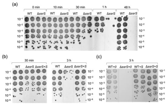 Reduced viability of 6S RNA-deficient cells in the presence of 20 mM H2O2 was also demonstrated by plating assays (Figure 5). A relative decrease in the number of ΔssrS colonies in comparison to the WT became evident 30 min after H2O2 addition. After 1 h of H2O2 treatment, where WT cells also showed reduced viability, ΔssrS bacteria gave rise to only very few colonies. After 48 h, WT cells had recovered from oxidative stress, whereas the ΔssrS culture was devoid of any viable cells (Figure 5a). In contrast, complementation strain ΔssrS+S fully restored the WT phenotype 30 min and 3 h post-stress induction (Figure 5b), whereas strain ΔssrS+0 yielded even fewer colonies than ΔssrS bacteria 3 h post-induction (Figure 5b,c).