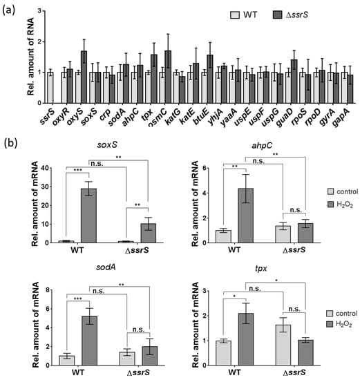 Relative expression levels (qRT-PCR) of selected mRNAs and non-coding RNA OxyS in E. coli WT and ΔssrS bacteria. (a) Standard conditions (in the absence of H2O2). No significant changes in expression levels were detected for any of the analyzed genes (standard t-test). (b) Genes with dysregulated mRNA levels in ΔssrS bacteria under H2O2 stress. Total RNA samples were isolated either before (control, light grey bars) or 10 min after treatment with 20 mM H2O2 (dark grey bars). Statistical analysis was performed by the two-way ANOVA test, p-values: ***—<0.001; **—<0.01; *—<0.05; n.s.—not significant. Relative amounts of mRNAs were normalized to 16S rRNA and mRNA levels of the WT strain in the absence of H2O2 were set to “1”.