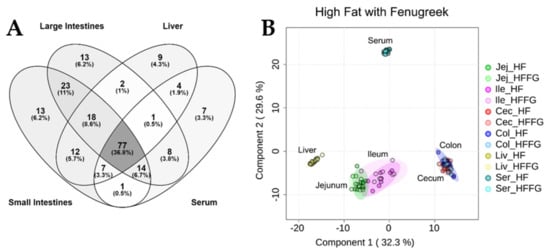 2.1. Significant Differences between Small Intestine, Large Intestine, Liver, and Serum