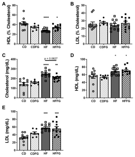 2.4. Fenugreek Supplementation Modulates HDL Balance and Total Cholesterol in HF Diet-Fed Mice