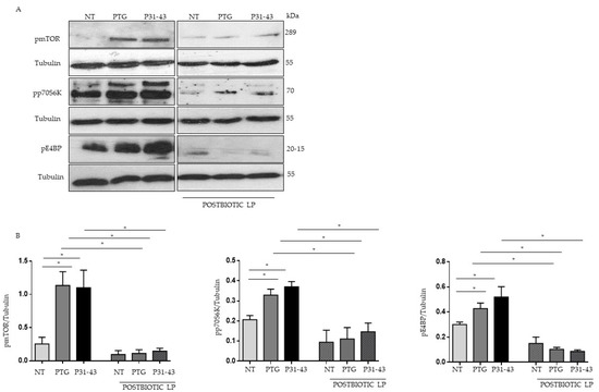 p-mTOR, p-S6K1, and p-4EBP were increased with respect to untreated cells (NT) after treatment with both p31-43 and PTG. Pretreatment with LP postbiotic was able to prevent the activation of the mTOR pathway in Caco-2 cells (Figure 1).