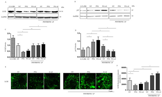 Autophagy markers LC3II and p62 protein, a protein necessary for autophagy progression, were evaluated before and after treatment with PTG and P31-43 for 3 (Supplementary Materials Figure S2) and 24 h (Figure 2) by Western blotting in Caco-2 cells. As described by Manai et al. [34], we observed a reduction of LC3II levels and an increase of p62 that was statistically significant only after 24 h of treatment with PTG and P31-43. All this indicates that both the PTG and P31-43 can reduce autophagy and its progression. Interestingly, pretreatment with postbiotic LP prevents the effects of gliadin peptides on LC3 (Figure 2A–C) and p62 levels (Figure 2B–D). Moreover, these data were also confirmed by immunofluorescence (Figure 2E).