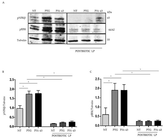 Both PTG and P31-43 are able to activate NFkβ [15,35], and PTG is described to activate mTOR [13]. MAPKs are involved in Iκκ-dependent NFkβ activation [36]. We tested the effect of the LP postbiotc on PTG, and P31-43 inflammation markers increased. For this purpose, Caco-2 cells were pretreated with LP postbiotcs for 1 h, and after being stimulated with PTG and P31-43, the activation of NFkβ and ERK was evaluated by WB. Our data showed an increase in NFkβ phosphorylation levels after stimulation with PTG and P31-43. The postbiotcs of LP reduced this phosphorylation (Figure 3A,B). Additionally, ERK activation was increased after PTG and P31-43 treatment [15] and, again, pretreatment with postbiotcs of LP prevented ERK activation (Figure 3A,C).