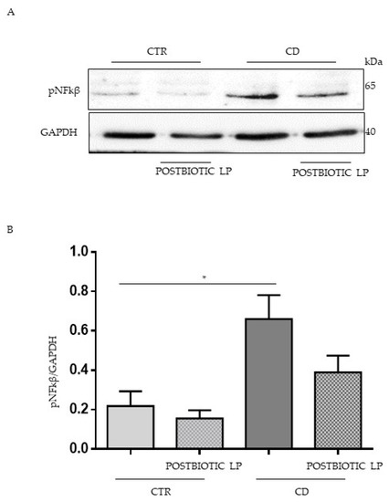 Next, we tested the effect of P31-43 on CD organoids using as a read out of the inflammation the phosphorylation of NFkβ. As shown in Figure 5A,B P31-43 caused a statistically significant increase in NFkβ phosphorylation; this effect was already described before [15]. LP postbiotc was able to prevent the increase of NFkβ phosphorylation induced by P31-43 on CD organoids.