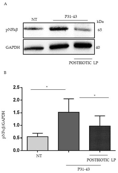 We showed that after pretreatment with the postbiotc LP, both the peptide P31-43 and the PTG effects on mTOR activity and the downstream pathway were prevented. Moreover, pNFkβ was also reduced in the presence of LP postbiotc and PTG or P31-43.