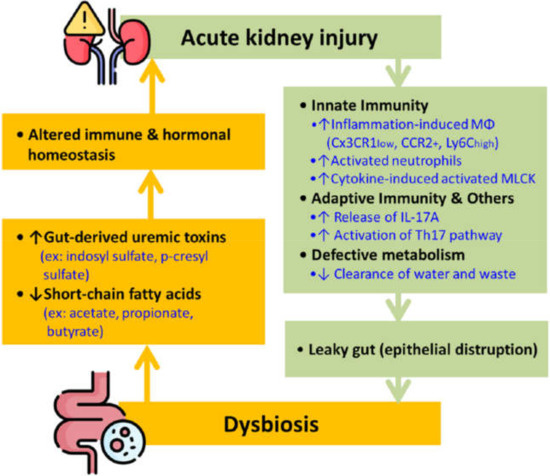 Speaking overall, AKI disturbs innate and adaptive immunities and metabolism by many pathways and subsequently damages the gut epithelial structure. Once this epithelial structure is disrupted, the gut becomes “leakier” and aggravates bacterial, inflammatory agents, and toxin translocation, causing dysbiosis.