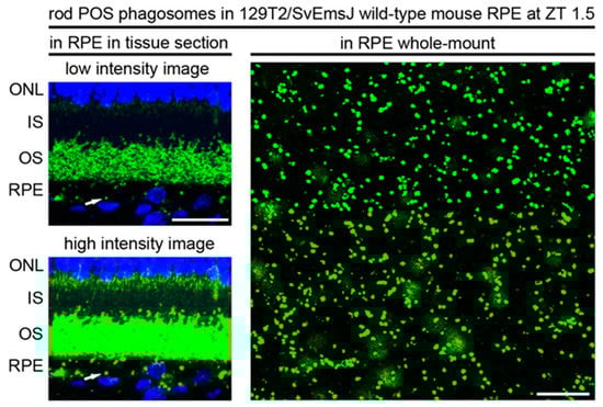 Whole-mount RPE phagosome assessment samples a higher number of RPE per sample than assessment in sagittal sections. Images show 129T2/SvEmsJ tissue obtained at ZT 1.5. Note that detection of RPE phagosomes in tissue sections (left panels) requires high-intensity imaging (lower left), resulting in overexposed intact outer segments (OS). A representative rod POS phagosome is indicated by the arrow. Quantification of high-intensity sections as shown yields a rod POS phagosomes content of 15.3 ± 1 phagosomes per 100 µm length of the central retina on average (mean ± S.D., n = 5 eyes from 5 different mice). Imaging the same rhodopsin staining in RPE whole-mount samples (image on the right as indicated) is not confounded by the presence of intact outer segments. Moreover, whole-mount observation allows quantification of the full phagosome load per cell in multiple cells per sample and, thus, importantly, robust assessment of cell-to-cell variability. Quantification of whole-mount images as shown yields 255 ± 29 phagosomes per (100 µm2) area of RPE on average (mean ± S.D., n = 5). For either quantification method, rhodopsin-positive particles were counted as phagosomes if their diameter was at least 0.5 µm. Scale bars in both fields are 20 µm. Tissue section data are reproduced from Esposito et al., Invest. Ophthalmol. Vis. Sci. 2021, 62, 7 [40]. RPE whole-mount data are reproduced from Mazzoni et al., Redox Biol. 2021, 42, 101918 [37].