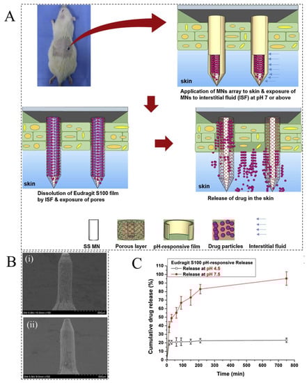 - Ullah, A.; Jang, M.; Khan, H.; Choi, H.J.; An, S.; Kim, D.; Kim, Y.R.; Kim, U.K.; Kim, G.M. Microneedle array with a pH-responsive polymer coating and its application in smart drug delivery for wound healing. Sens. Actuators B Chem. 2021, 345, 130441. [Google Scholar] [CrossRef]