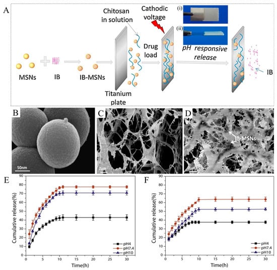 - Zhao, P.; Liu, H.; Deng, H.; Xiao, L.; Qin, C.; Du, Y.; Shi, X. A study of chitosan hydrogel with embedded mesoporous silica nanoparticles loaded by ibuprofen as a dual stimuli-responsive drug release system for surface coating of titanium implants. Colloids Surf. B Biointerfaces 2014, 123, 657–663. [Google Scholar] [CrossRef]