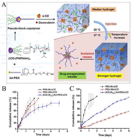 - Song, X.; Zhang, Z.; Zhu, J.; Wen, Y.; Zhao, F.; Lei, L.; Phan-Thien, N.; Khoo, B.C.; Li, J. Thermoresponsive hydrogel induced by dual supramolecular assemblies and its controlled release property for enhanced anticancer drug delivery. Biomacromolecules 2020, 21, 1516–1527. [Google Scholar] [CrossRef]
